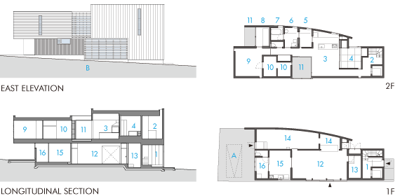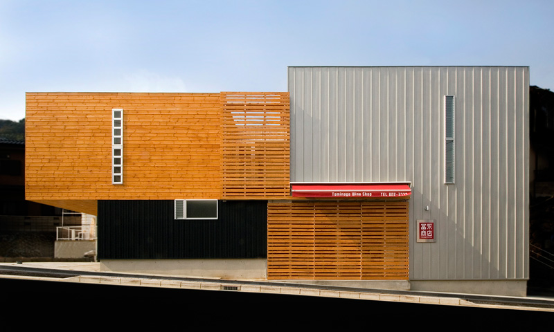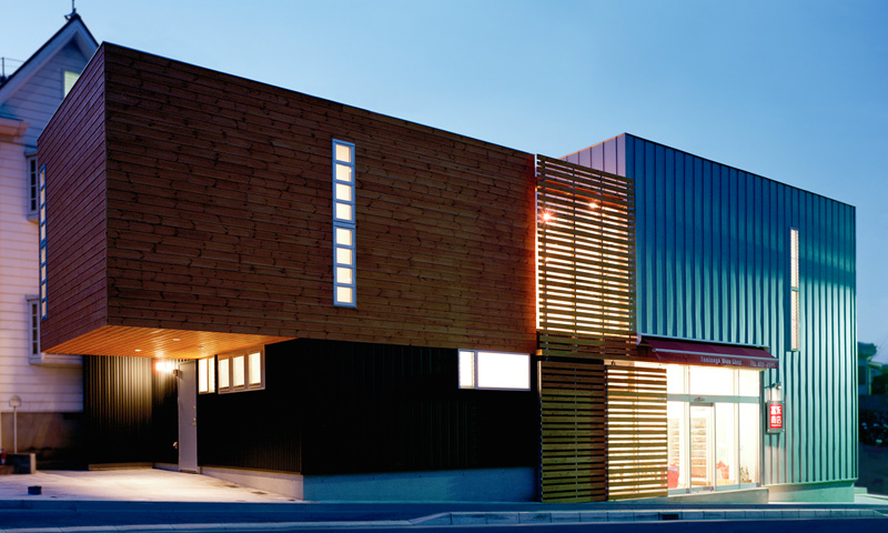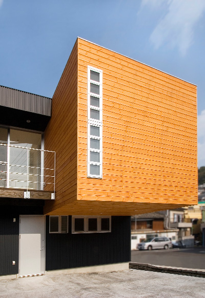 長崎市大浦地区に建つ木造2階建の住宅。丘陵地のふもとに位置し、1階に店舗を併設する。市の道路拡幅計画により、およそ半分の敷地が買収対象となったため、建替えが計画された。間口約24.5m、奥行き約5.5mの直角三角形状の不整形な敷地のなかで、親世帯の住宅+子世帯の店舗といった変則的な2世帯併用住宅に籠められた高密度な要求をいかに空間として実現させるかが設計のテーマとなった。奥にある個子世帯が生活する既存の建物を避けつつ、住宅と店舗、さらに配達用の駐車スペースと搬入スペースなどを確保すべく、2階部分をキャンチレバーで持ち出している。空中にせり出す木の箱のシルエットと、木製ルーバー越しに漏れ出す光は、この住宅を周辺の環境から際立たせるとともに、郊外の市街地の風景にアクセントをもたらしている。