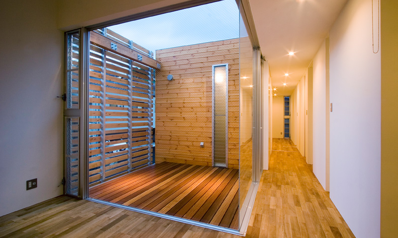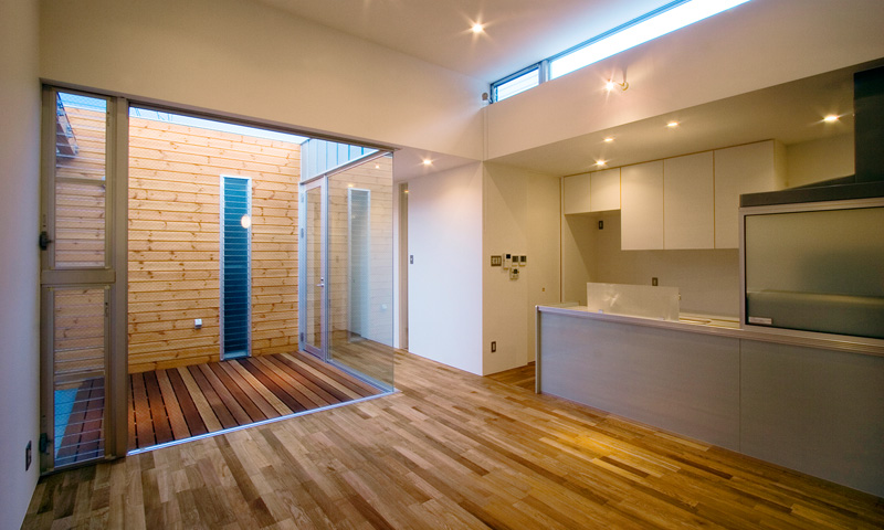 トップライトと光庭をボックス内に計画し、細長い筒の中に自然採光を確保します。リビングのハイサイドライトは朝の光を招き入れます。