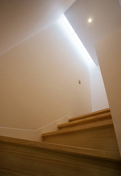 トップライトからの光がやわらかく階段を照らす。