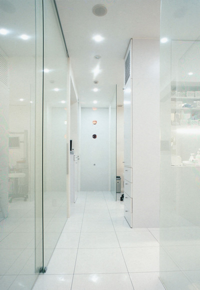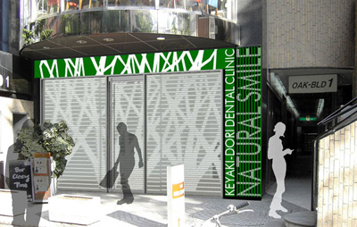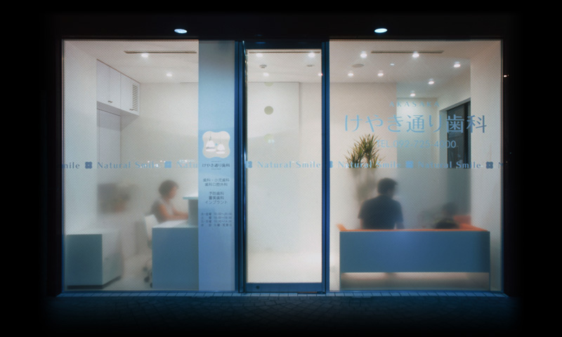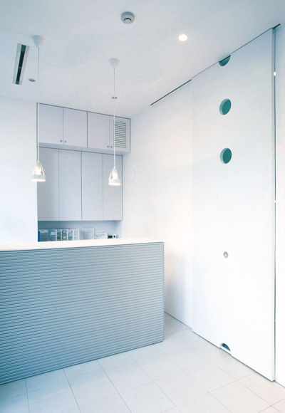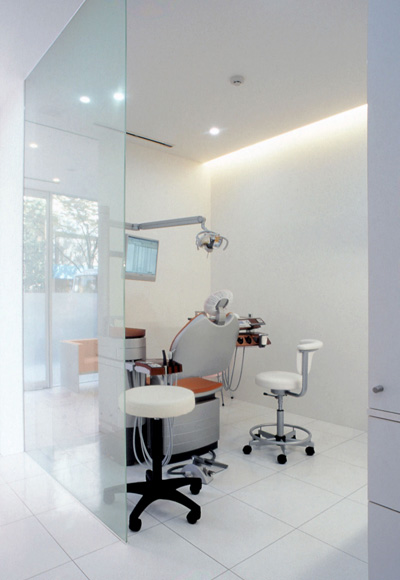 福岡市の商業の中心地、天神地区に新規開業する歯科診療所の内装計画。建物前面の道路沿いはケヤキの街路樹が並木道をつくり、初夏の新緑から秋の紅葉まで心地のよい木陰と憩いの場をこのエリアに提供する。予約外来を前提としているテナントの性格上、派手な色彩の看板を大々的に掲げた施設より、このエリアの景観に馴染みながらも、存在感やオリジナリティを感じることができる“場”が求められた。比較的ゆったりと歩道に面して配置された受付と待合室は、白色のニュートラルな空間を背景としたプレゼンテーションステージでもあり、スタッフの日常のアクティビティや働いている姿が表通りの景観を構成する動的な要素となる。トータルな空間の総体が、この歯科診療所のコンセプトを発信する “宣伝装置”となるように計画されている。
