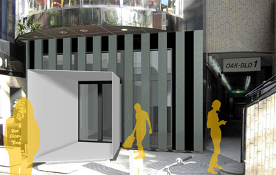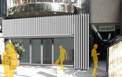 A. 半透明なガラスのスクリーンを通して、中の様子が外にも伝えられる。屋内外の双方向のコミュニケーションを可能とする受付と待合いスペース。下はCGによるファサードのスタディ。施設イメージを表すサインの効果も兼ね備えたファサードの検討。